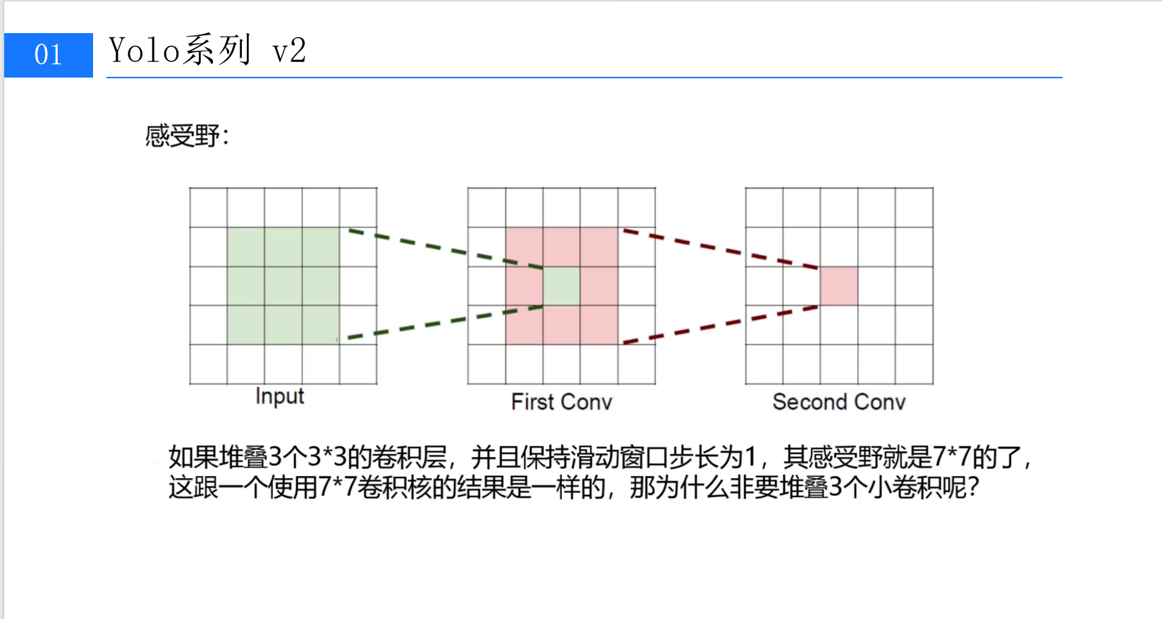 传统卷积网络常用大尺寸卷积核(如7×7)快速扩大感受野,但YOLOv2反其道而行之,选择了堆叠3×3小卷积核。这并非偶然,而是经过精密计算的工程选择。(第2张图:左侧“Input”“First Conv”“Second Conv”的网格图,展示两次3×3卷积后感受野从1×1扩展至7×7的过程)