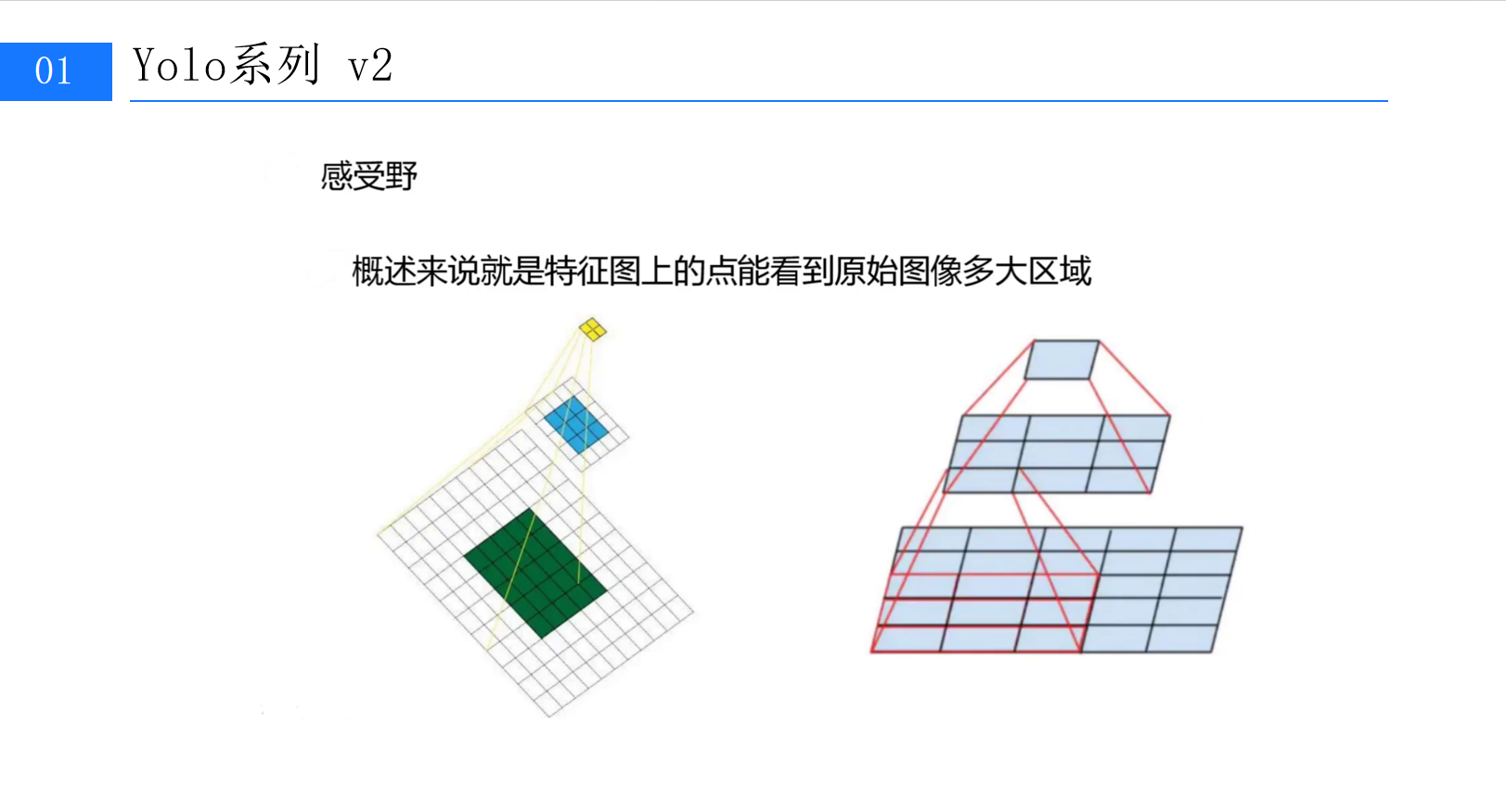 在上篇中,我们系统梳理了YOLOv2从基础架构到核心模块的革新,包括Batch Normalization的稳定训练、高分辨率分类器的细节捕捉、DarkNet骨干网络的轻量高效,以及Anchor先验框与定向定位预测的定位优化。如果说上篇是YOLOv2的“骨架搭建”,那么本篇将深入其“神经末梢”——那些看似细微却决定性能的细节设计:感受野的精准控制、细粒度特征的融合复用,以及多尺度检测的动态适配。这些设计共同将YOLOv2推向了“速度与精度”的新平衡点。(第1张图:标题为“Yolo系列 v2”的感受野概念示意图,左侧黄色小方块与蓝色/绿色方块的连接直观展示特征图与原始图像的映射关系)