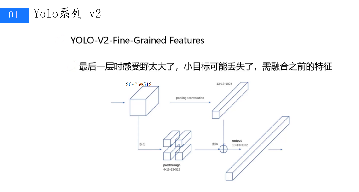 为解决小目标丢失问题,YOLOv2提出了细粒度特征融合(Fine-Grained Features)方案,核心是引入Passthrough层。其设计逻辑是:将浅层网络的高分辨率、小感受野特征与深层网络的高语义、大感受野特征融合,为小目标提供更丰富的细节信息。