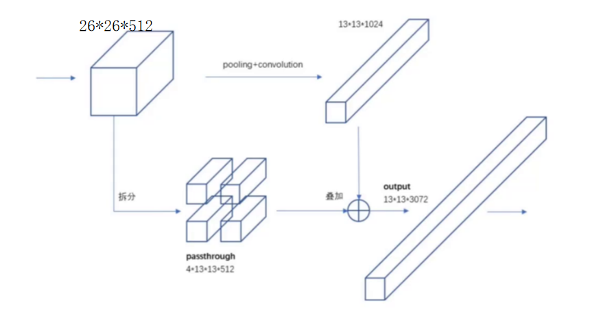 具体实现上,YOLOv2选取了倒数第二层的26×26×512特征图(记为F1),通过Passthrough层将其“拆解”为4×13×13×512的特征(记为F1’)。这里的“拆解”是将每个2×2的空间区域展平为4个独立的1×1区域(类似空间到深度的转换),从而将特征图尺寸从26×26压缩至13×13(与最后一层13×13×1024的特征图F2尺寸对齐)。