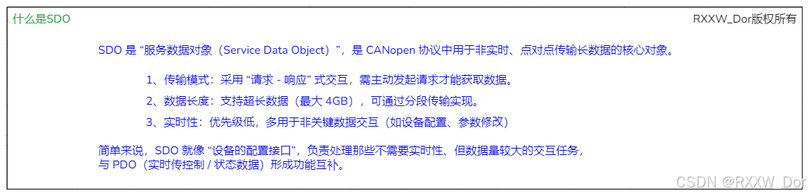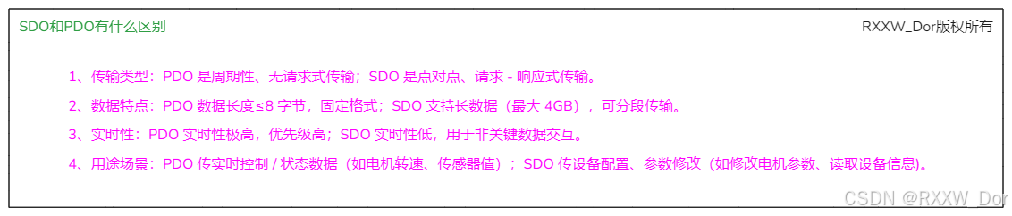 SDO 和 PDO 都是 CANopen 协议的核心数据对象,核心区别是 PDO 侧重实时周期性传输短数据,SDO 侧重非实时点对点传输长数据。我们将它们的区别整理如下