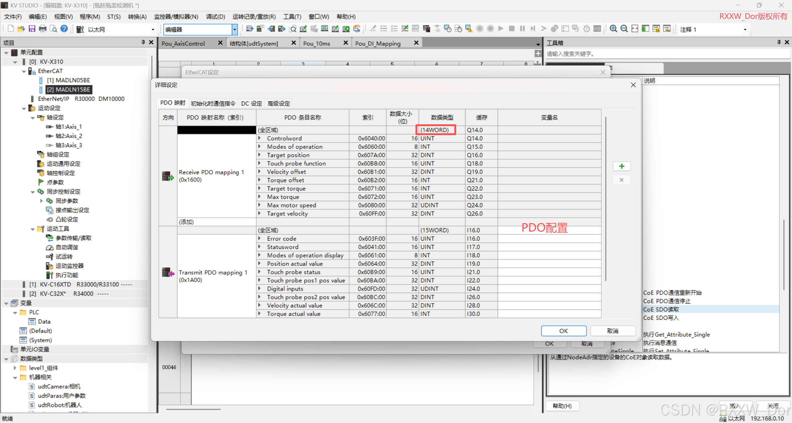这是因为图中展示的是PDO 映射的 “逻辑配置”,实际传输时会通过多 PDO 拆分或协议扩展来满足 CANopen 的 8 字节限制,具体解释如下: