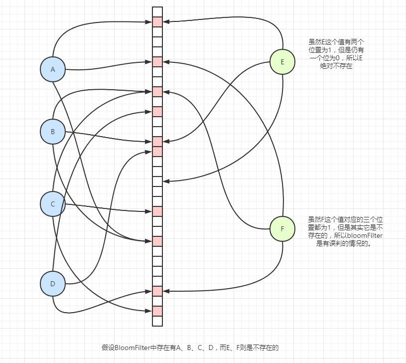 当判断一个元素是否存在时,就去判断这个值哈希出来的比特位是否都为1,如果都为1,那么可能存在,也可能不存在(如下图F)。但是如果有一个bit位不为1,那么这个Key就肯定不存在。