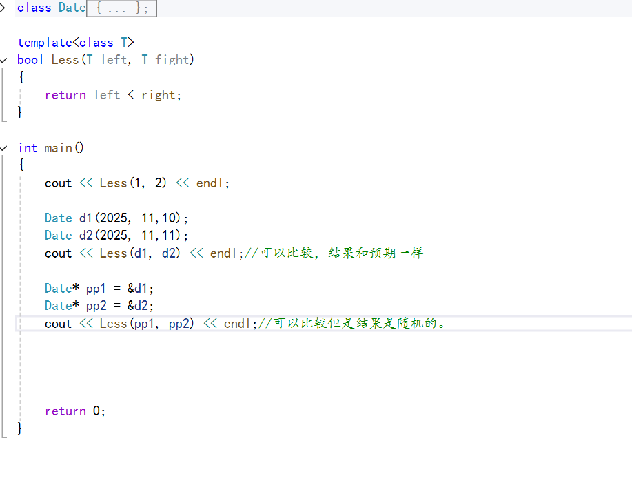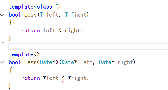 我们使用模板的时候,是想其脱离数据类型,实现我们的逻辑。但是对于一些特殊的数据类型,我们进逻辑运算的时候,其逻辑是比较特殊的,所以我们特殊处理,比如说我们实现一个比较大小的函数: