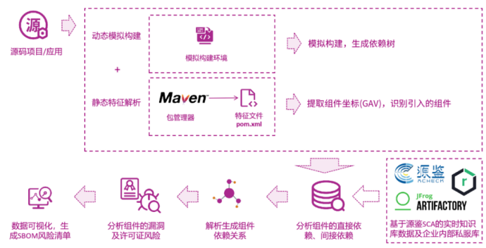 相比于传统的静态SCA检测,在基础检测能力上采用动态模拟构建的方式,通过模拟组件的编译构建过程,并结合静态解析方式来检测组件依赖及漏洞,二者结合大大提升组件依赖分析的准确率及组件漏洞匹配的精准度。此外,相较于运行时SCA,该解析方式也无需通过插桩模式去检测,在使用场景上更为简单。