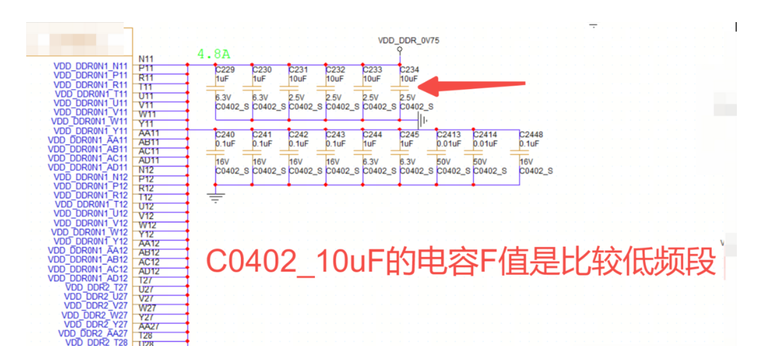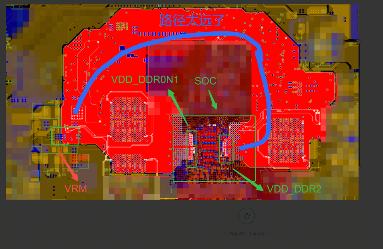 六,通整体的布局来看,造成这个0.5MHz-0.7MHz之间是不满足要求的原因主要还是VRM模块的布局离主芯片上的VDD_DDR2的电源网络管脚位置太远了,理想的VRM布局位置其实还是在中心的位置比较好些,这样离左右两边的负载端口的距离都差不多了。
