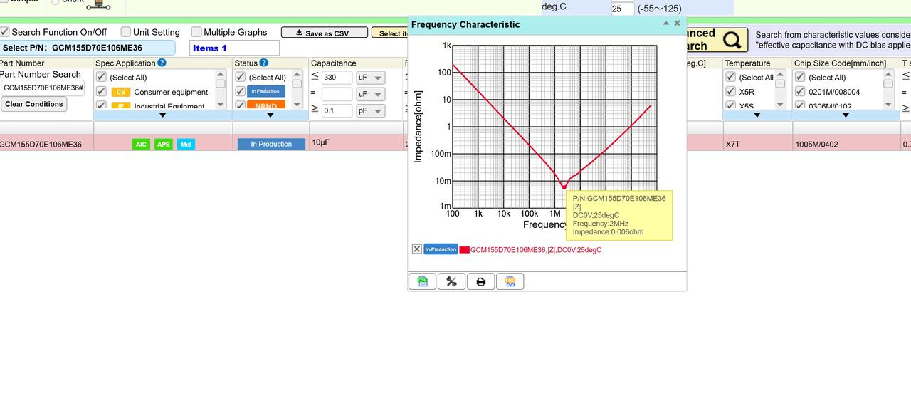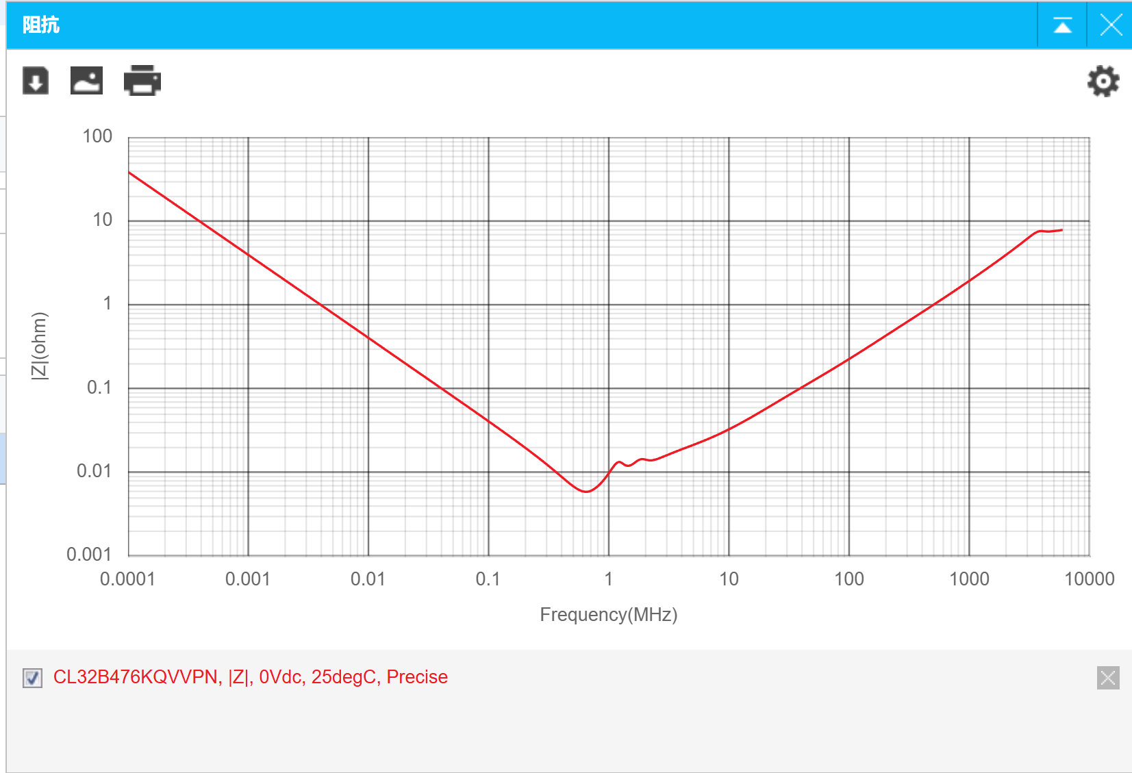 四,通过负载芯片上原理图的设计发现只有C0402_10uF的电容勉强算是相对来说是低频段的了,这个电容的阻抗频率特性曲线如下所示:F=2MHz,阻抗是最低为6mohm。