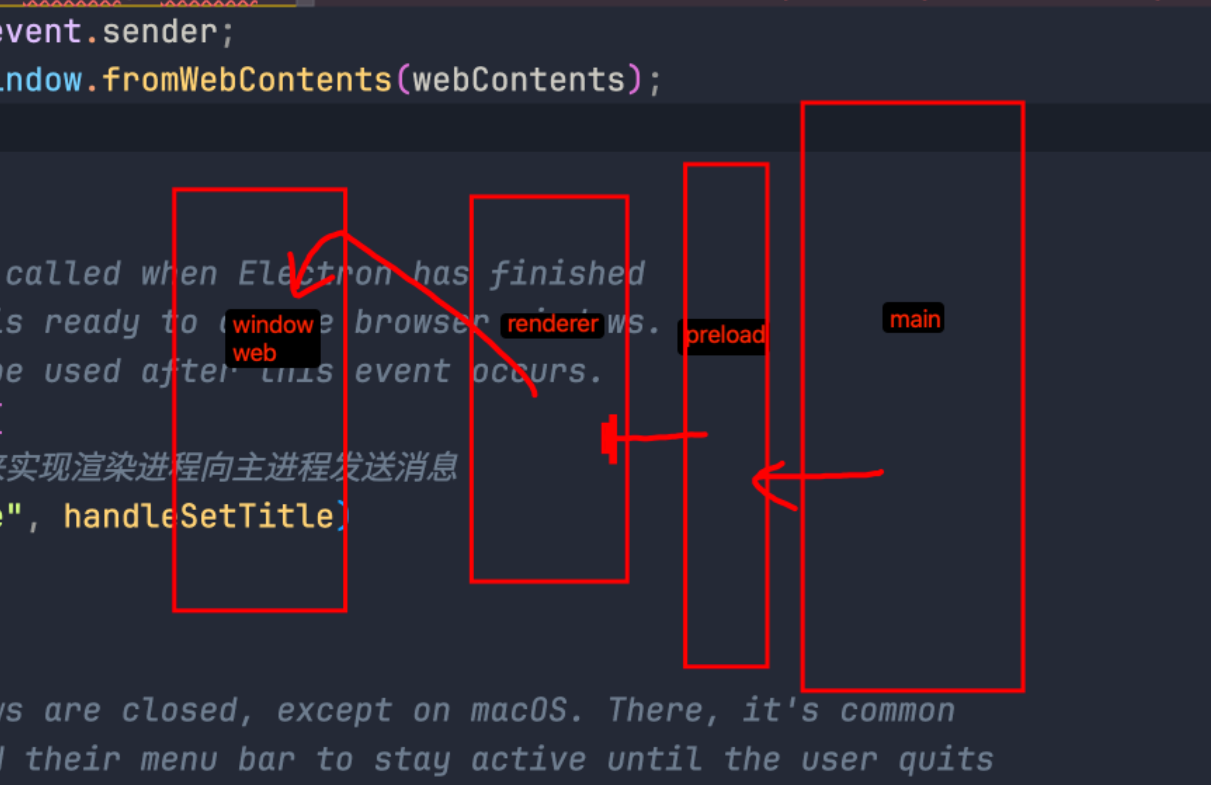 const path = require('node:path');function handleSetTitle(event, title) {const webContents = event.sender;const win = BrowserWindow.fromWebContents(webContents);win.setTitle(title);