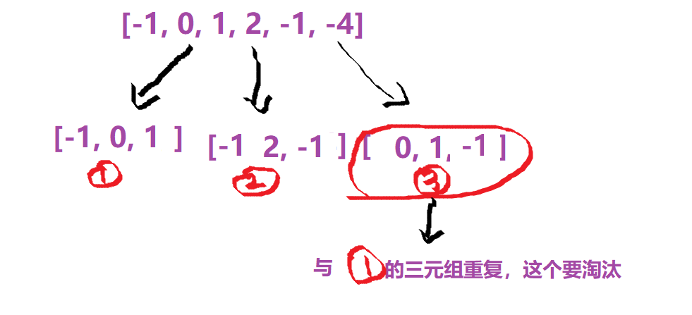 阅读完这道题大概不太能理解,仔细看玩例子会清楚知道题目的要求。题目要求在一组整数组中,找到三个数组成三元组,这一组中三个数之和为0,并且出现的三元组不能有重复的。