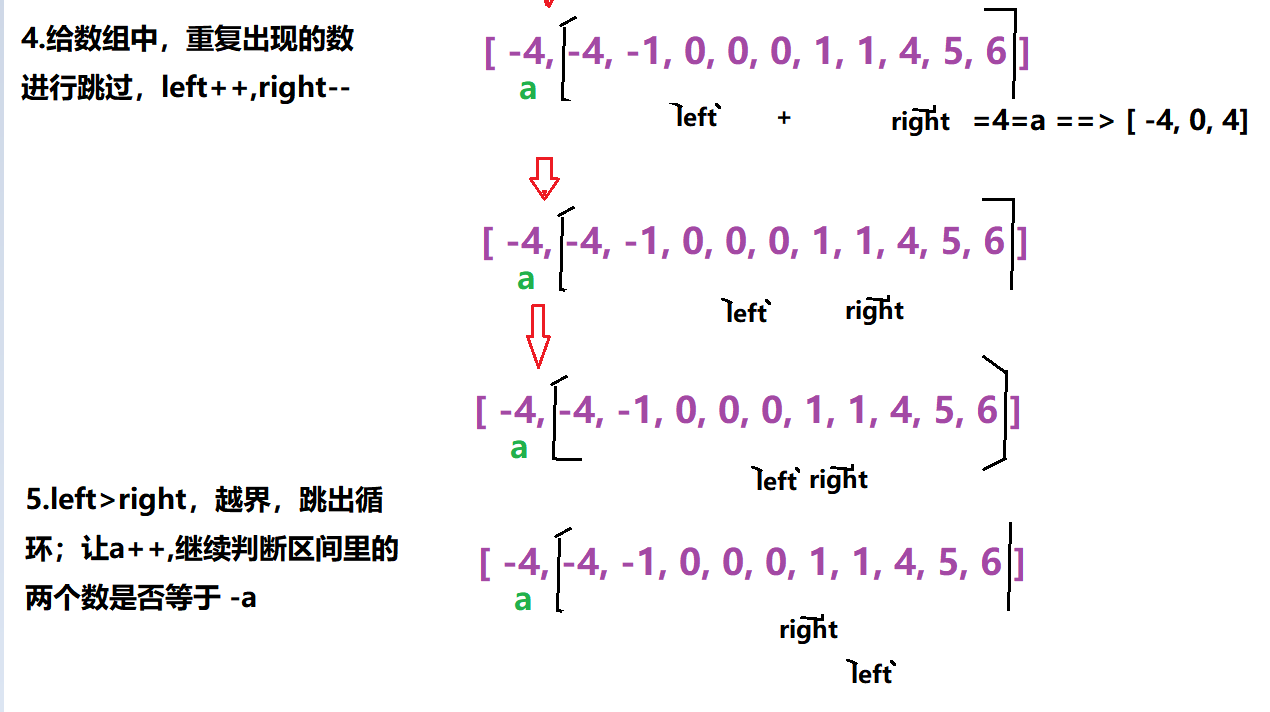 需要注意细节的问题,在数组中,我们对区间中重复出现的数要进行跳过,并且不要遗落遍历数组时,重复出现的“固定的数a”,也要进行跳过;这样就可以排除重复出现的三元组。