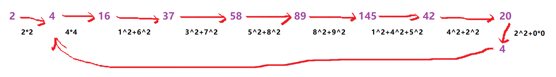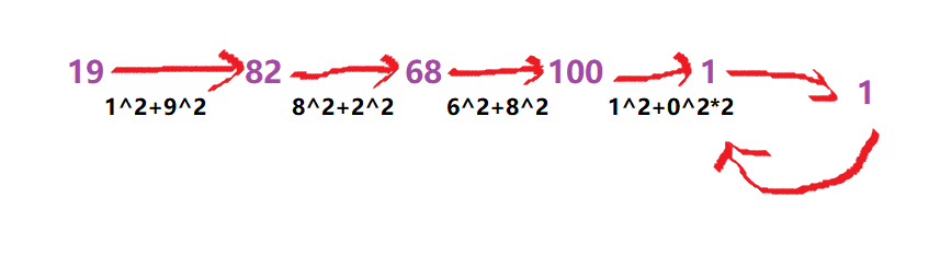看完题目并结合例子,从画图可以联想到快慢指针的方法;慢指针走1步快指针走2步,当慢指针的值为1时,就可以判断该数为快乐数。