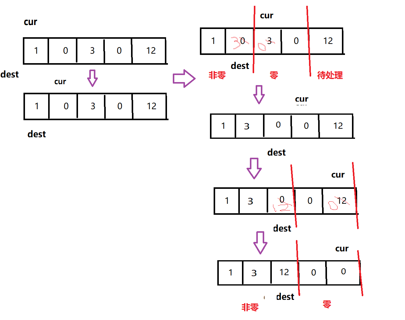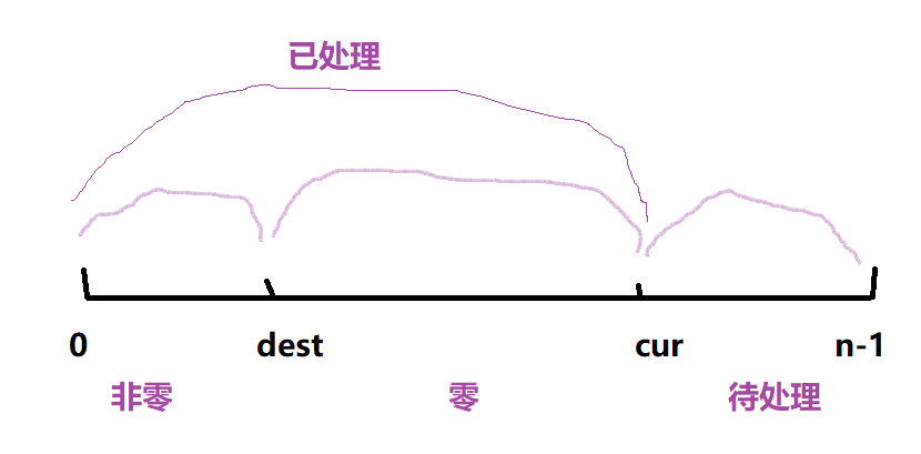 当cur走到‘0’,用把dest+1下标的元素与cur都是0元素,不需要交换,cur++