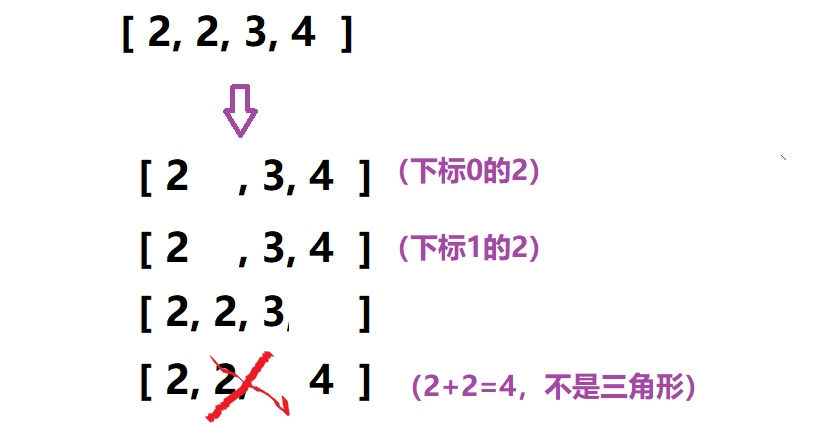 看完题目并结合例子,需要任意两条边之和大于第三条边才是三角形