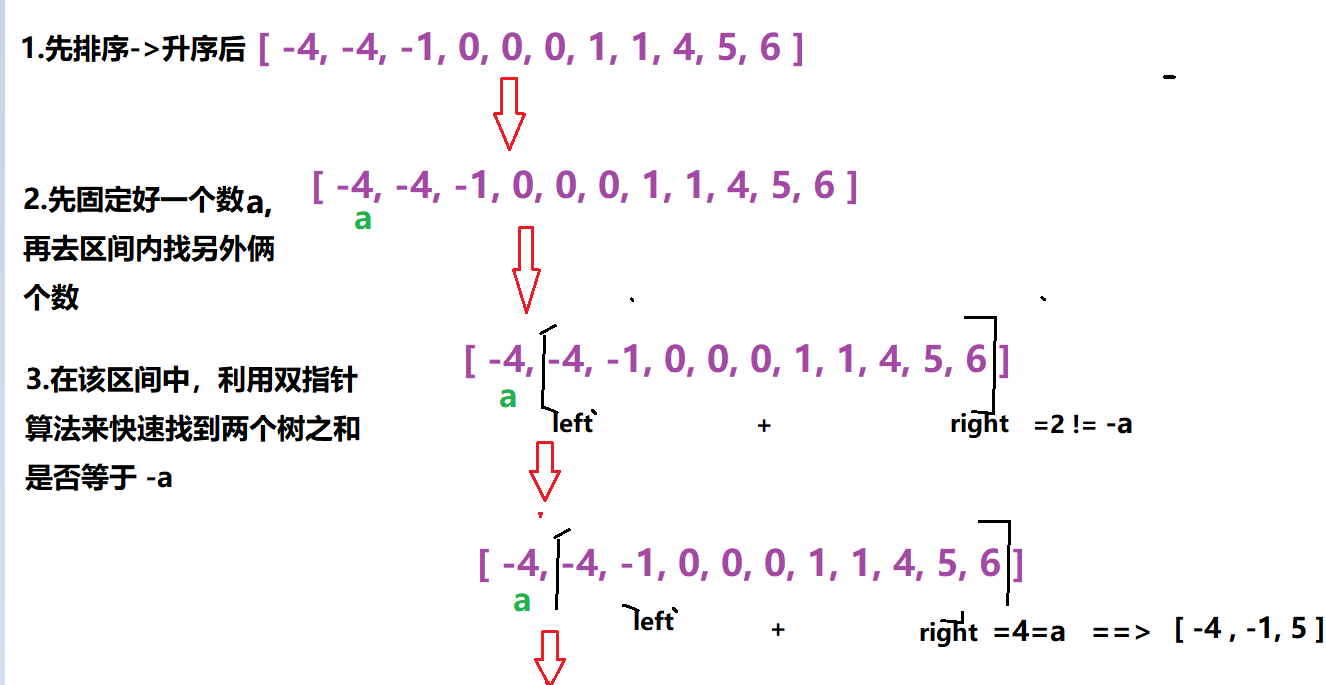 public:vector<vector<int>> threeSum(vector<int>& nums) {vector<vector<int>> ret;// 1.排序sort(nums.begin(),nums.end());// 2.用双指针解法int n = nums.size();for(int i=0;i<n;) //固定一个数a{int left=i+1,right=n-1,target=-nums[i];while(left<right){int sum = nums[left] + nums[right];// 当区间中俩数之和大于目标数if(sum>target){right--;}// 当区间中俩数之和小于目标数else if(sum<target){left++;}else{//把得到的三元组放进ret中ret.push_back({nums[i],nums[left],nums[right]});left++,right--;//去重操作//当区间第一个数和第二数一样就去掉,left++ ;防止在区间中越界while(left<right && nums[left]==nums[left-1]){left++;}while(left<right && nums[right]==nums[right+1]){right--;}}}//遍历数组中,找固定的数也会有重复现象,所以也要去重i++;while(i<n && nums[i]==nums[i-1]){i++;}}return ret;}
