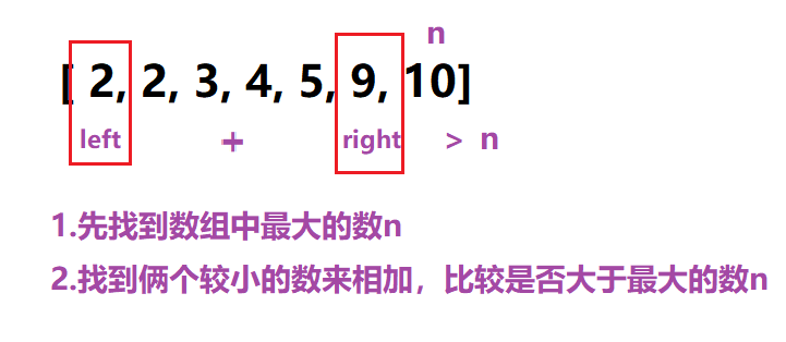 2.创建俩个指针,让left从下标为0开始,right从i-1位置开始。当left+right>n,说明2+9>10能成为一组三角形,用ret来计数,再让right-- ;当left+right<n,就left--
