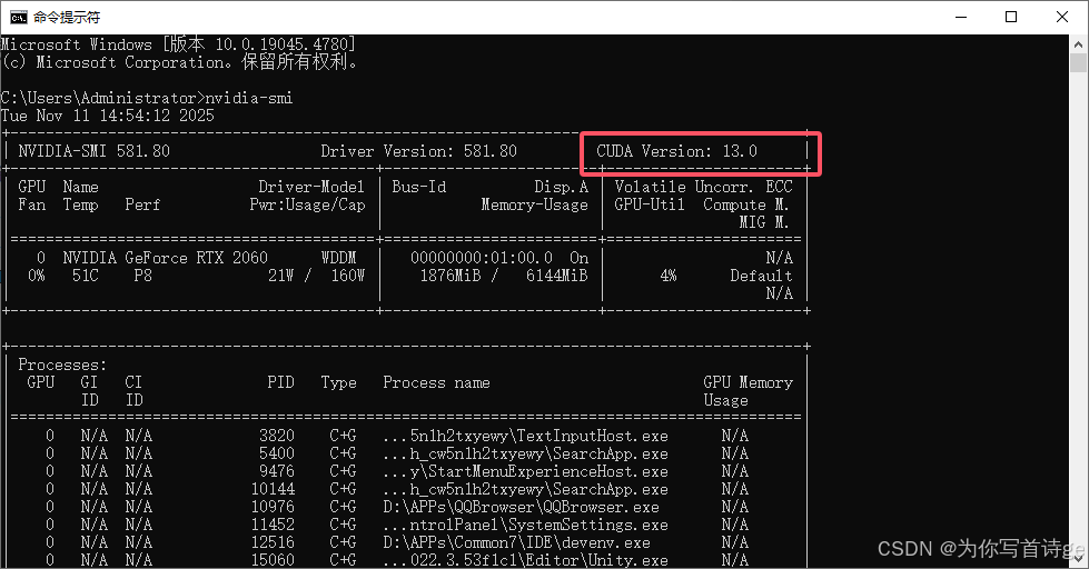 在输出信 息中,留意 CUDA Version 这一项,它表示你的驱动最高支持的CUDA版本。例如,显示"CUDA Version: 12.6"意味着你后续安装的PyTorch所依赖的CUDA工具包版本不能高于12.6。