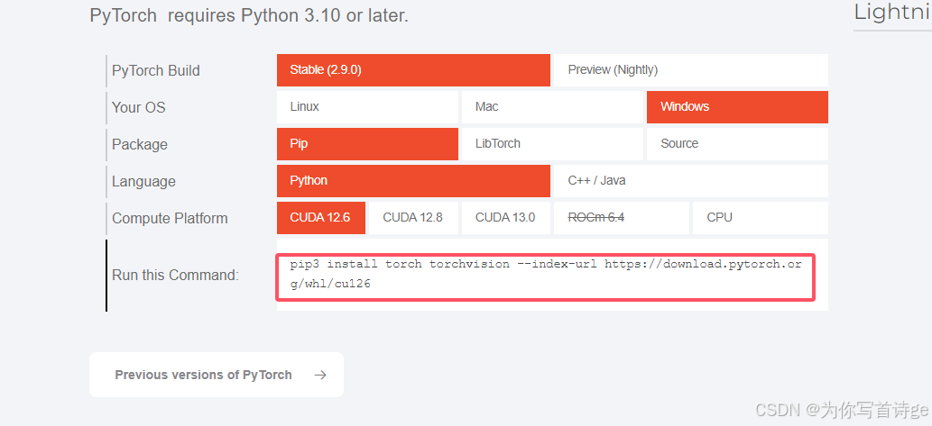 打开 PyTorch官网,根据你的操作系统、包管理器(Conda或Pip)、Python版本以及CUDA版本,选择相应的配置,网站会自动生成最匹配的安装命令。