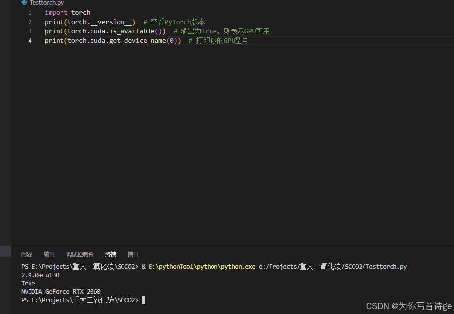 4.1 创建Python测试文件,运行以下代码,如果 torch.cuda.is_available() 返回 True,恭喜你,安装成功了