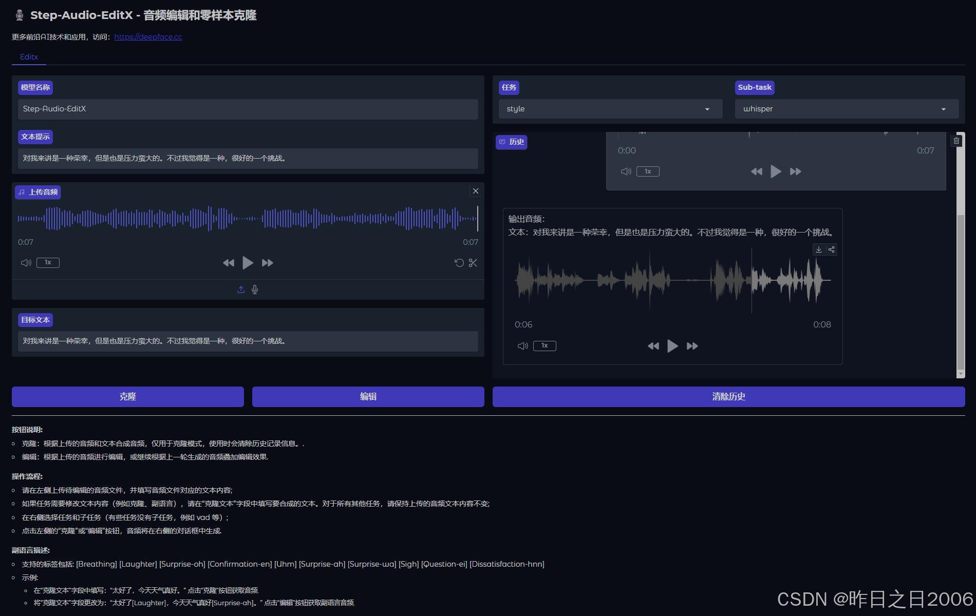 上传需要编辑的参考音频,输入参考音频文字内容,输入需要编辑的目标文本(支持情感和风格等标签插入),选择任务类型(比如克隆,情感编辑),克隆和编辑选择不同的提交按钮,注意区分克隆和编辑按钮,克隆按钮只能选择clone任务类型