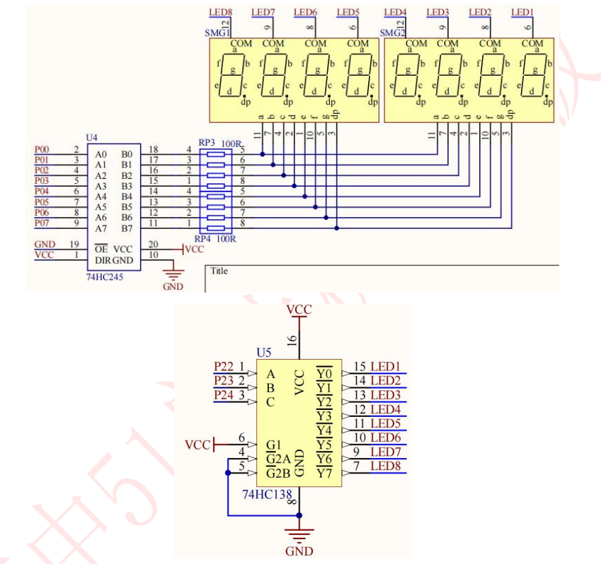 - 段码位码配合:在点亮某一位数码管时,74HC245送出该位需要显示的数字对应的段码,同时74HC138选中这一位数码管。