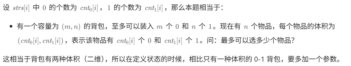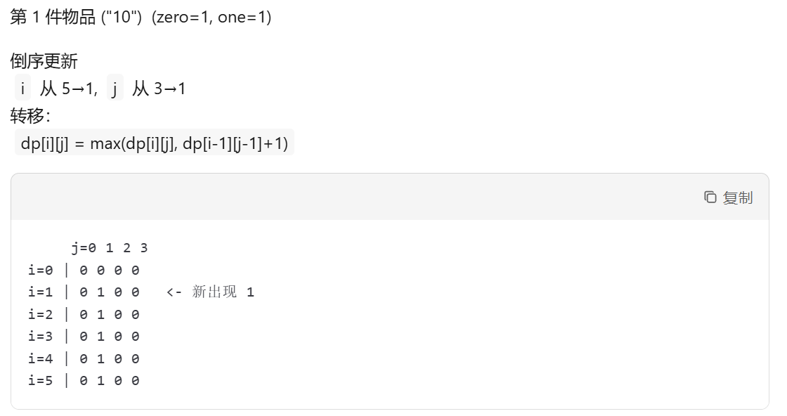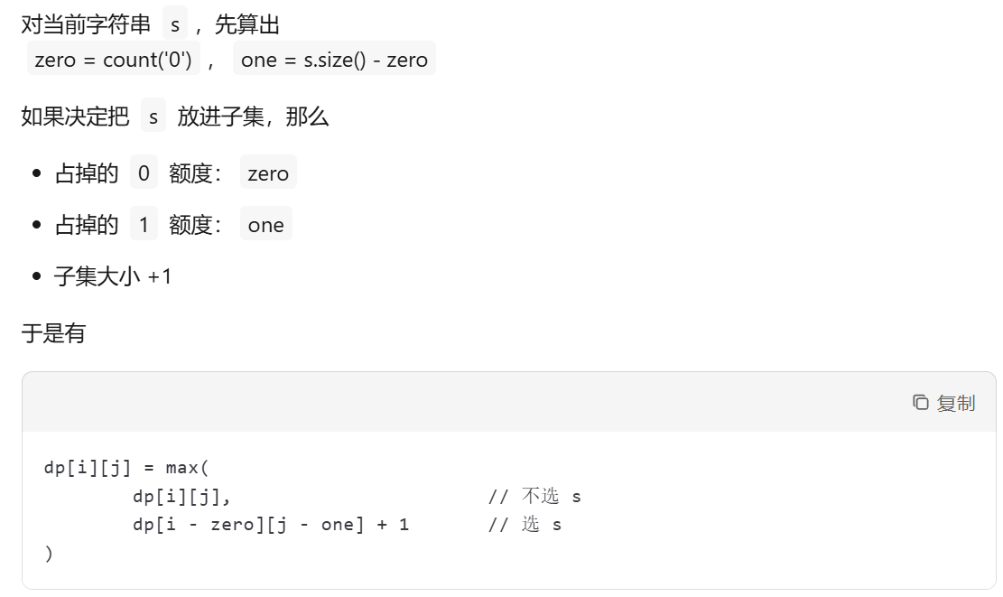 dp[i][j]:“在最多使用 i 个 0 和 j 个 1 的前提下,能够选出的最大子集大小(物品件数)”