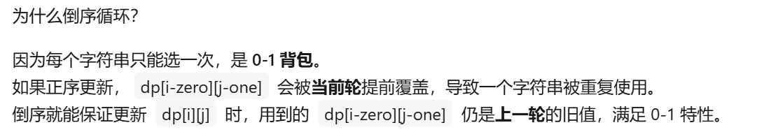 本题是“选 or 不选”每个字符串,典型的 0-1 背包,所以必须倒序。