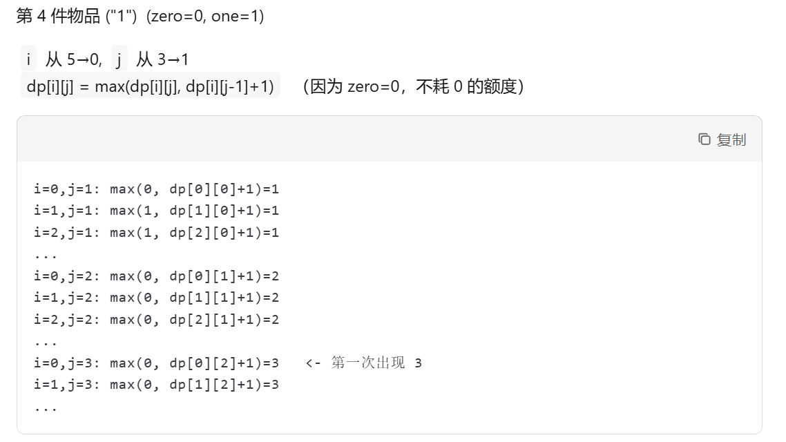 此时 dp[0][3]=3,意思“只耗 0 个 0、3 个 1最多能选 3 件”。
