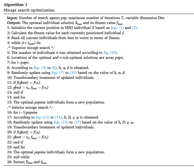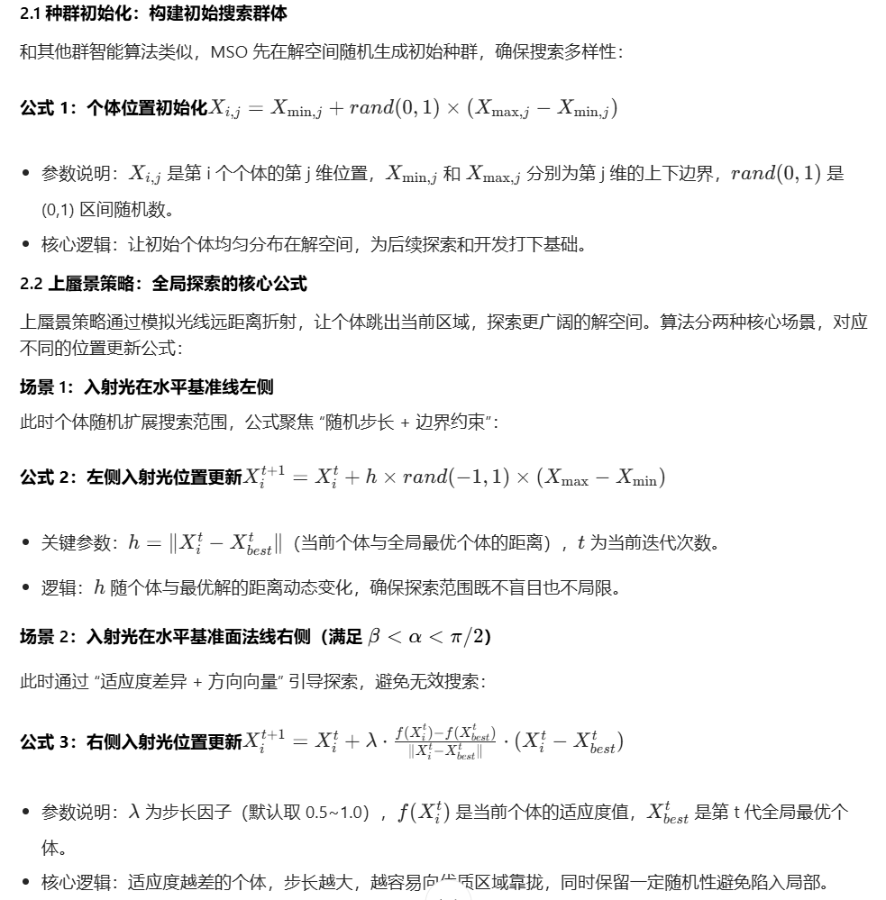 MSO 的数学模型围绕 “种群初始化→上蜃景探索→下蜃景开发→迭代更新” 四大步骤展开,每个公式都对应明确的物理意义,新手也能看懂推导逻辑: