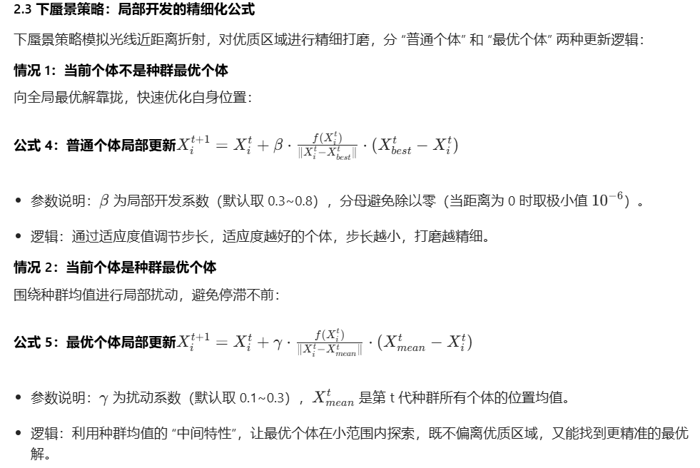 - 下蜃景开发:所有个体进行局部精细搜索,提升解的精度。