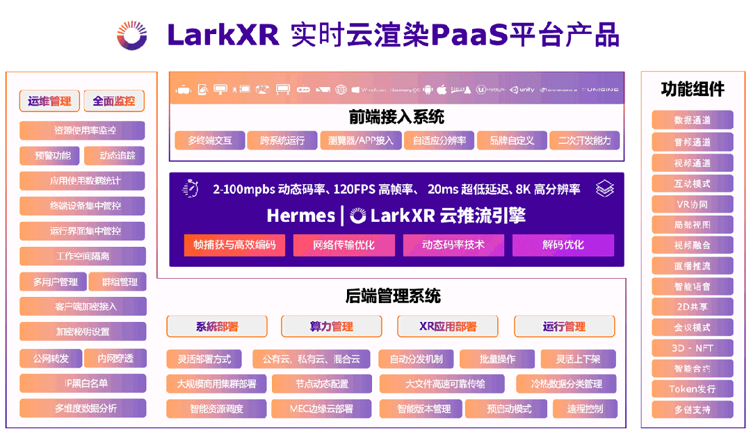 实时云渲染是一个更为宏观和完整的技术体系,通常泛指第三方商业化软件平台,如LarkXR。LarkXR不仅仅具备像素流的推流传输能力,更是一套涵盖“云-网-端”的PaaS平台,