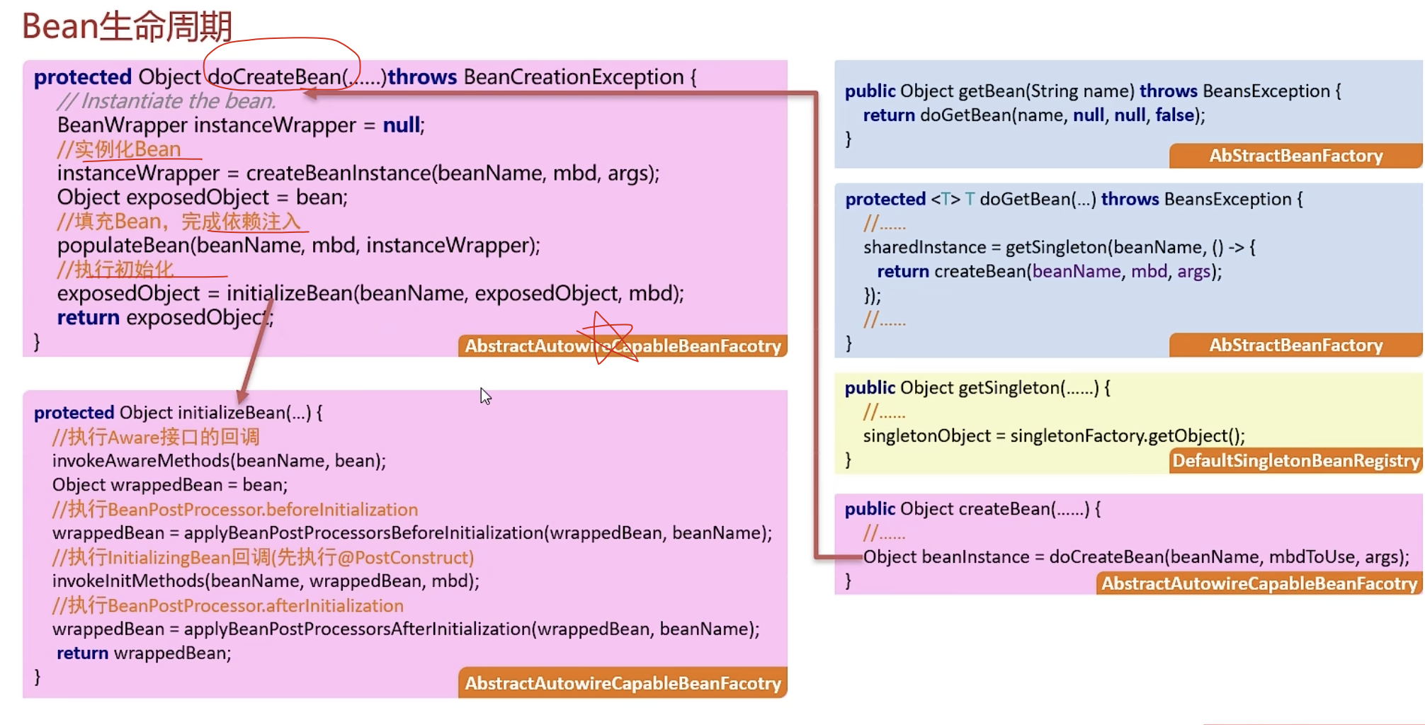 其次,对象创建完毕后,需要做一些初始化(真正决定 Bean 的最终形态)的操作,在这里涉及到几个扩展点: