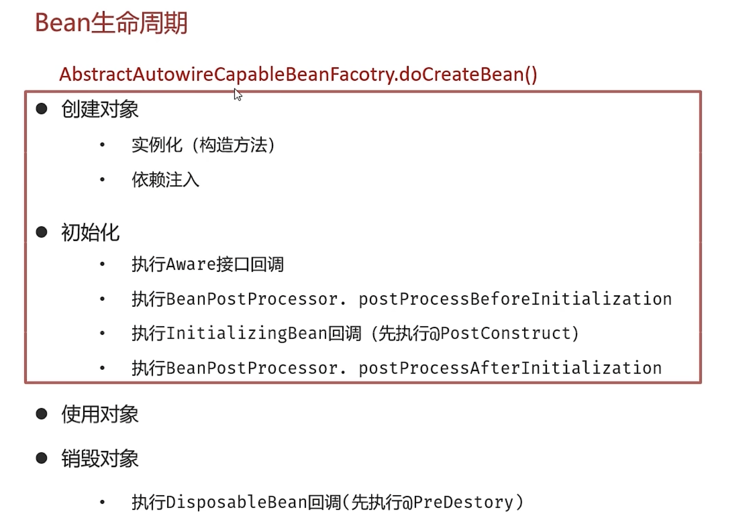 Bean 的生命周期总体来说有 4 个阶段,分别有创建对象、初始化对象、使用对象以及销毁对象,而且这些工作大部分是交给 Bean 工厂的 doCreateBean 方法完成的。