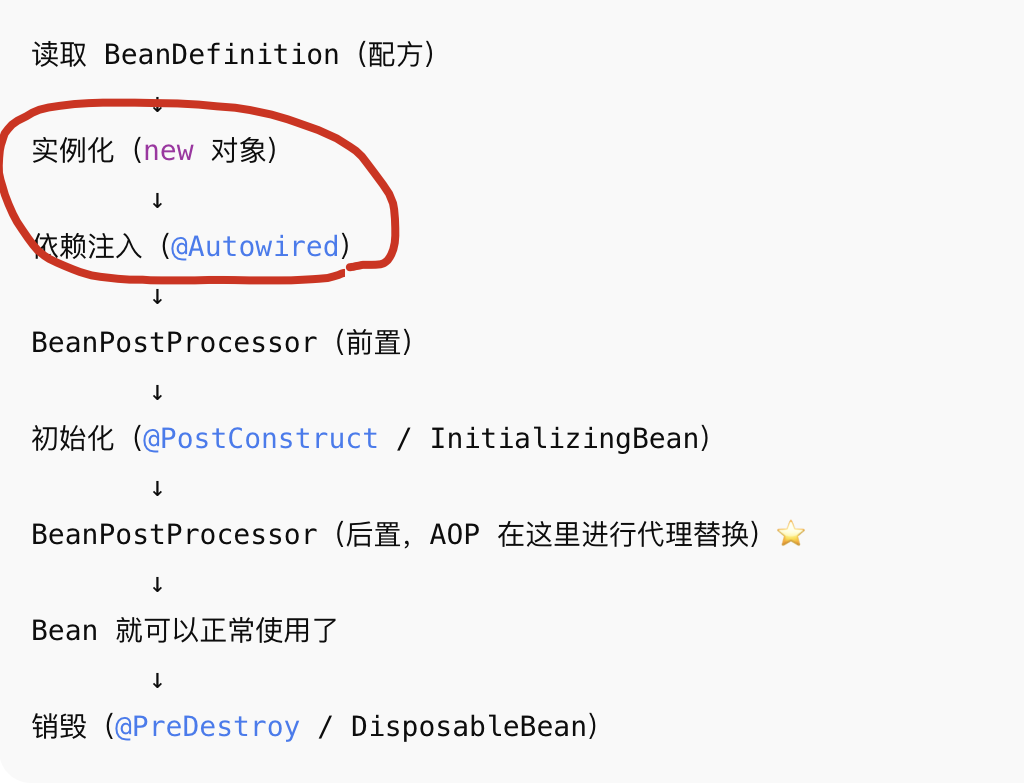 首先,在创建对象阶段,先调用构造方法实例化对象,对象有了后会填充该对象的内容,其实就是处理依赖注入。
