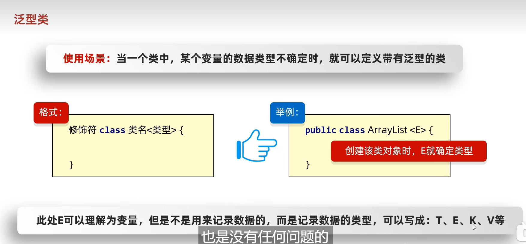 public class MyArrayList<E> {Object[] obj = new Object[10];int size;/** E:表示不确定的数据类型* e:形参的名字,变量名字* */public boolean add(E e){obj[size] = e;size++;return true;}public E get(int index){return (E)obj[index];}@Overridepublic String toString() {return Arrays.toString(obj);}