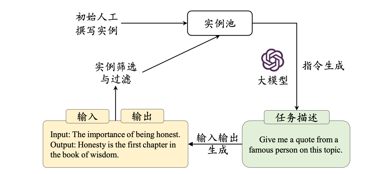 代表性工作Self-Instruct 方法仅需要使用100 多个人工撰写的实例作为初始任务池,然后随机选择数据作为示例,就可以通过提示大语言模型生成新的指令微调数据。这种半自动化的合成方法具备高效生成大规模指令微调数据的能力,从而显著降低了人工标注所需的经济成本,在实践中得到了广泛应用。