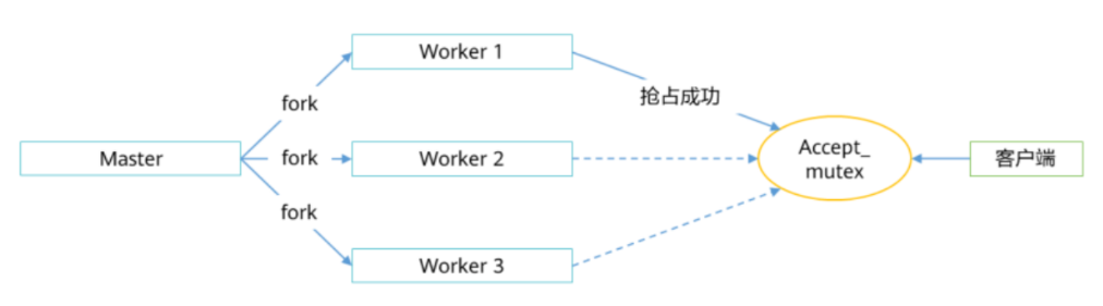 当客户端发起请求时,会激活accept_mutex互斥锁,哪个worker抢占了该互斥锁,该客户端的请求就由那个worker响应和处理
