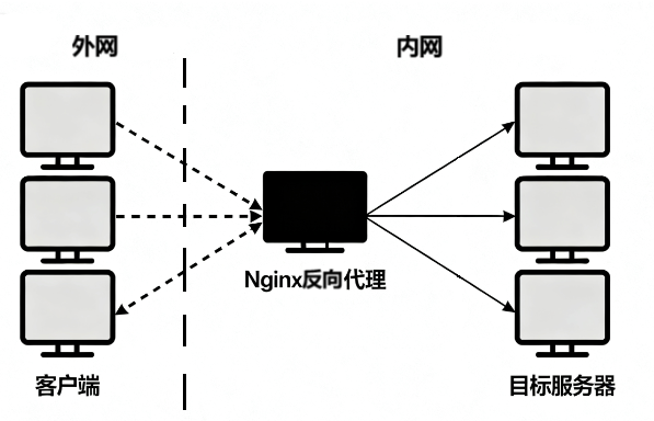 反向代理是位于客户端与后端服务器之间的代理服务器,客户端直接访问代理服务器,代理服务器将请求转发至后端服务器并返回结果,客户端无需知晓后端服务器信息