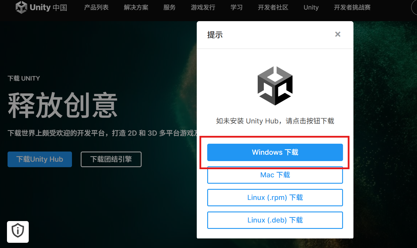 2 点击下载UnityHub,这里需要登录UnityID,没有的话注册一下。根据自己的电脑系统进行选择,这里以Windows系统为例。