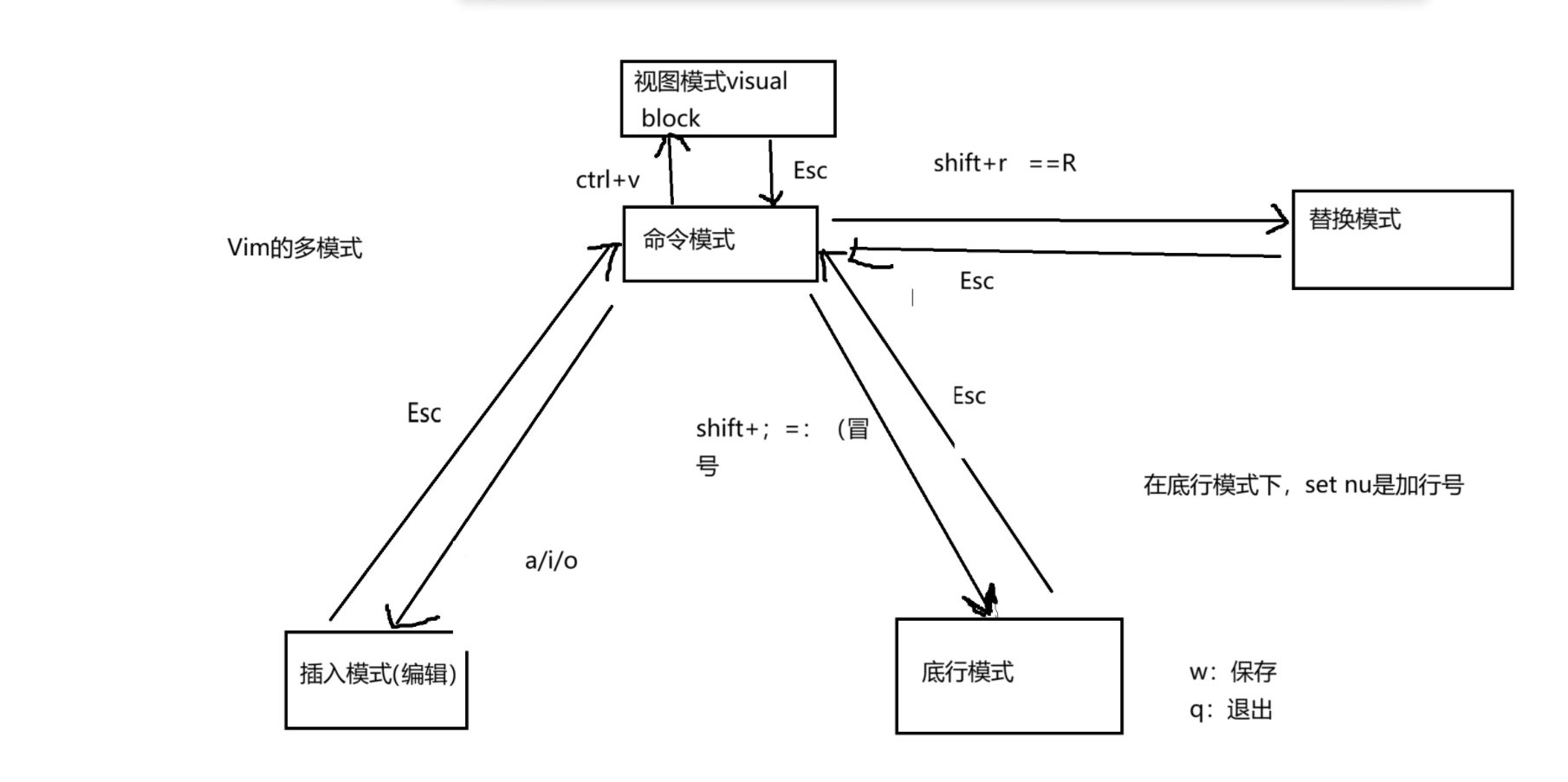 Vim有好多模式,先掌握五种,分别是命令模式,底行模式,替换模式,插入模式和视图模式。