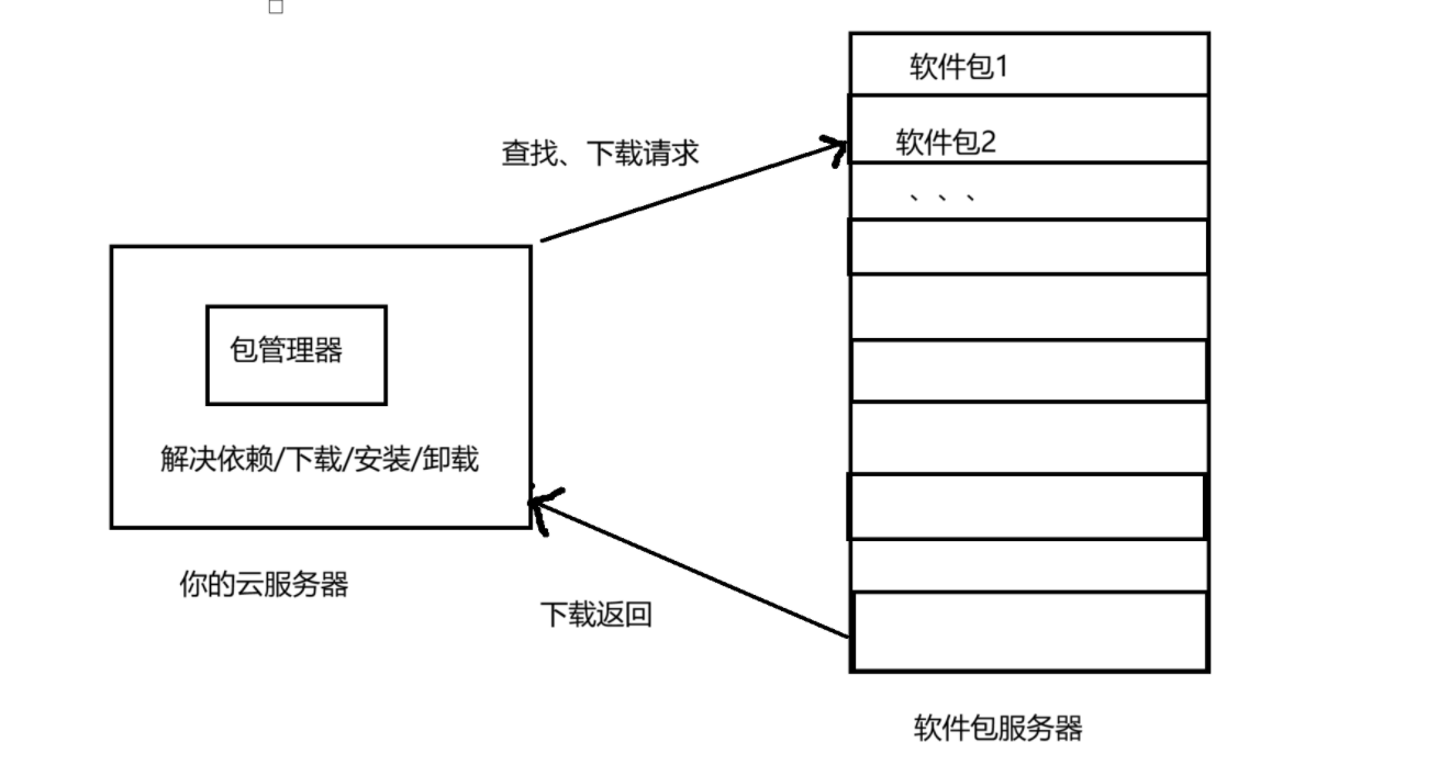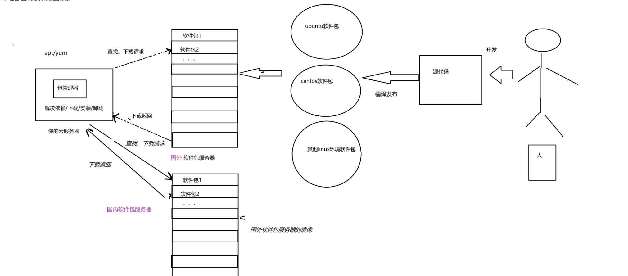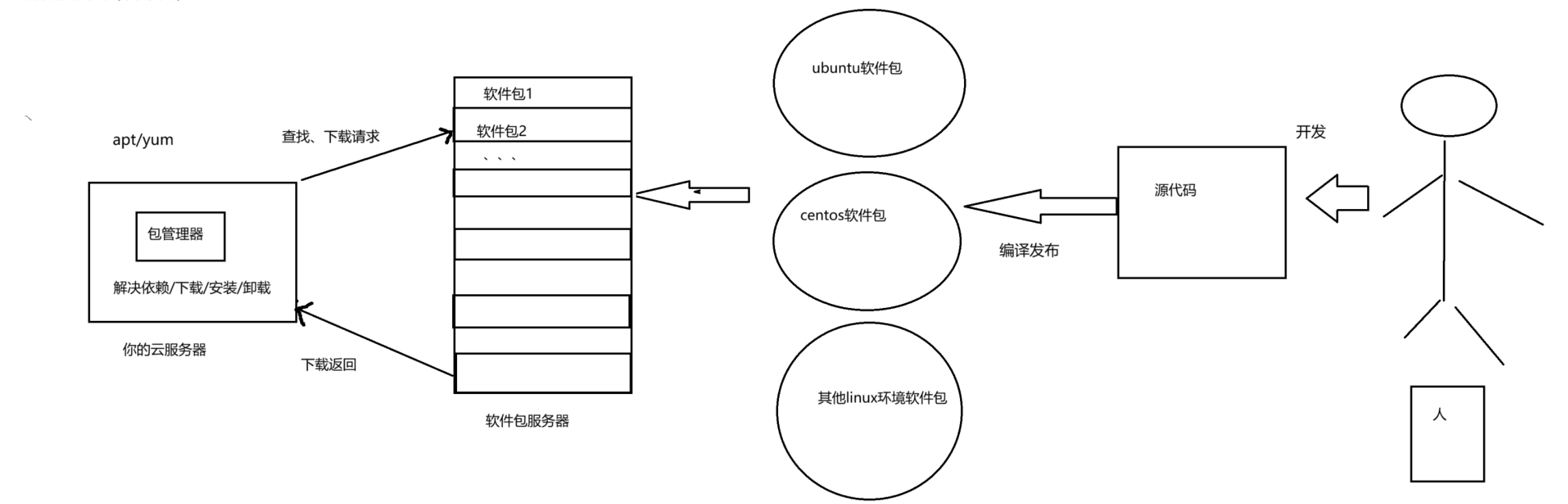 有人愿意免费开发软件,源代码发布到各个平台,每个平台内部有自己的软件包服务器,包服务器会有地址信息,地址信息会被记录在云服务器的特定路径中。