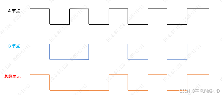 为什么这么设计?——线与逻辑:这种显性/隐性的设计实现了一种“线与”逻辑。如果网络上任何一个节点将总线拉低到显性电平(‘0’),那么无论其他节点想输出什么,整个总线都被表现为显性电平。只有当所有节点都“放手”(输出隐性电平‘1’)时,总线才表现为隐性电平。这为错误检测和帧类型的扩展提供了基础。