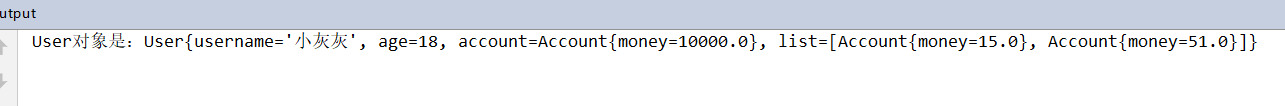 public class User implements Serializable{private String username;private Integer age;private Account account;private List<Account> list;@Overridepublic String toString() {return "User{" +"username='" + username + '\'' +", age=" + age +", account=" + account +", list=" + list +'}';}public List<Account> getList() {return list;}public void setList(List<Account> list) {this.list = list;}public String getUsername() {return username;}public void setUsername(String username) {this.username = username;}public Integer getAge() {return age;}public void setAge(Integer age) {this.age = age;}public Account getAccount() {return account;}public void setAccount(Account account) {this.account = account;}