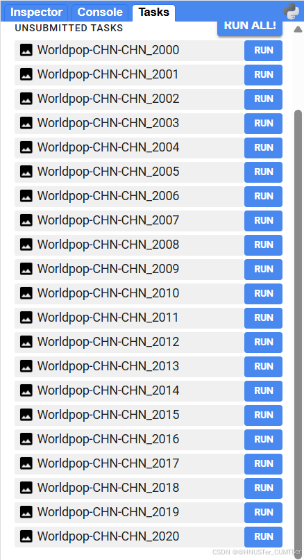 image:当前循环筛选并转换后的单景影像(如 2000 年Int16类型影像);geometry:导出区域(即研究区域);fileName:导出文件名称,格式为 “Worldpop-CHN - 年份”(如Worldpop-CHN-2000),通过字符串拼接("Worldpop-CHN-" + indexs[i])生成,确保每个年份的文件名称唯一,避免导出时覆盖。
