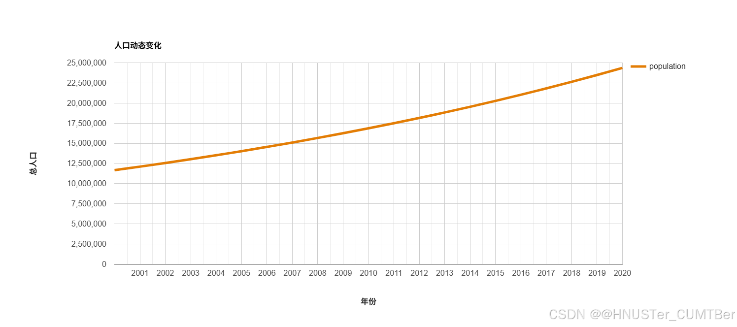 - 鼠标悬停在折线上,查看具体年份的 “总人口数”(如悬停在 2020 年,显示 “2020: 1400000000”);