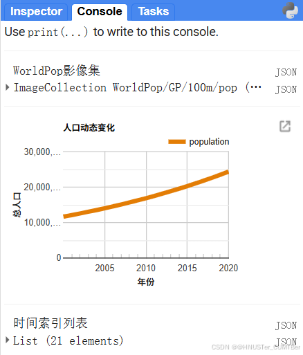 print("WorldPop影像集", worldpop)- 作用:在 GEE 控制台的 “Console” 面板输出处理后的影像集信息,用于验证数据是否正确。
