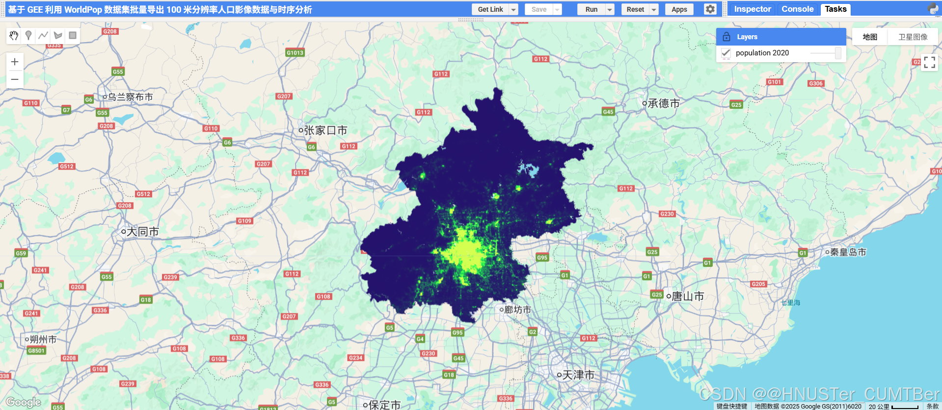 Map.addLayer(...)- 作用:将 2020 年人口影像添加到 GEE 地图窗口,通过颜色差异直观展示人口分布差异。