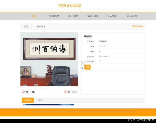 本传统文化网站有管理员和用户两个角色,管理员有,个人中心,用户管理,文章类型管理,文章信息管理,投票信息管理,留言板管理,系统管理。用户有个人中心,我的收藏,发布文章,发布留言。因而具有一定的实用性。