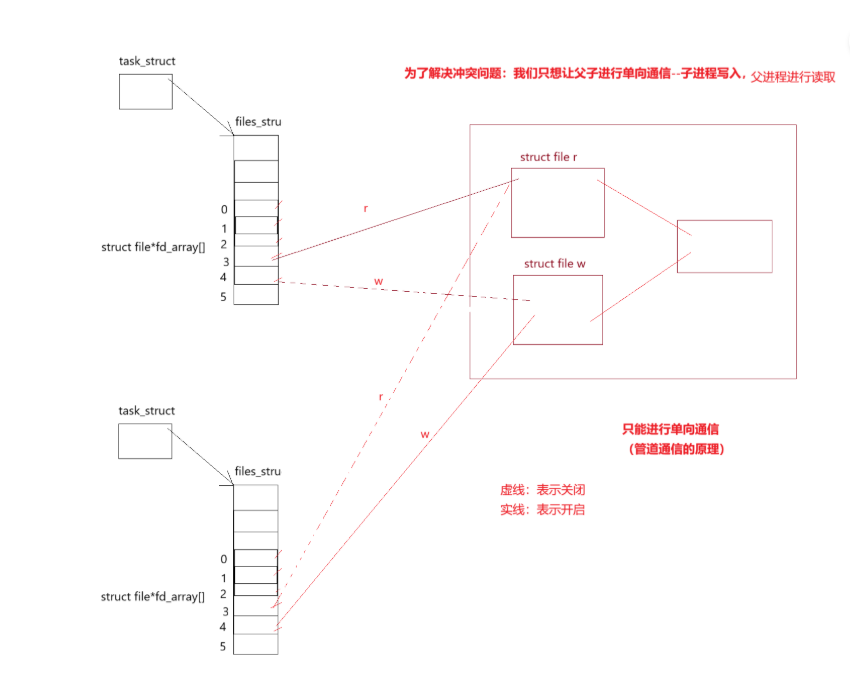 两个不同进程打开同一个管道文件时,内核中仅维护1份文件资源( struct file ),但每个进程的 files_struct (文件描述符表)会通过不同的描述符(如读端、写端)指向这份资源。