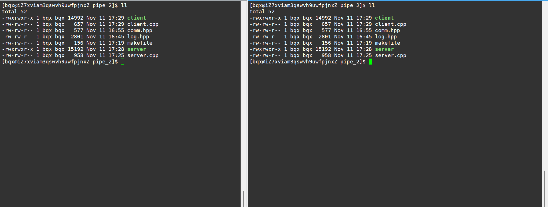 #include<iostream> #include "log.hpp" #include"comm.hpp" #include<string.h>#define SIZE 1024 Log lg; int main() {Init it;lg.Enable(Screen);lg(Info,"Init done");//打开管道int fd=open(MYFIFO,O_RDONLY);printf("fd:%d",fd);if(fd==-1){lg(Fatal,"error string:%s,error code:%d",strerror(errno),errno);exit(FIFO_OPEN_ERR);}lg(Info,"open done...");//开始读取数据while(true){char buffer[SIZE];int n=read(fd,buffer,sizeof(buffer));if(n<0){lg(Fatal,"strerr:%s,error code:%d",strerror(errno),errno);break;}if(n==0){lg(Debug,"client quit,me too,strerr:%s,error code:%d",strerror(errno),errno);break;}else{buffer[n]=0;std::cout<<"client say#: "<<buffer<<std::endl;}}close(fd);return 0; }