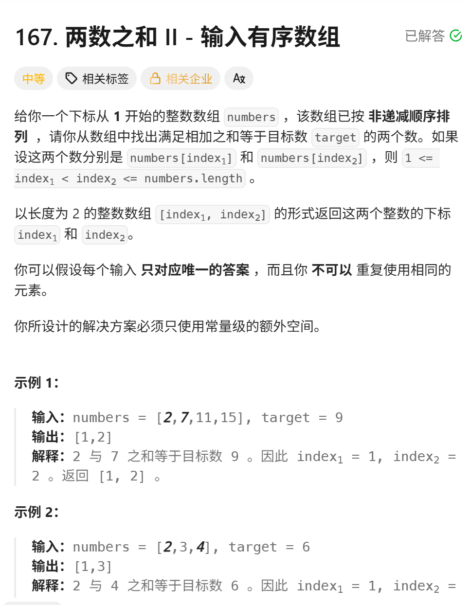 167. 两数之和|| - 输入有序数组